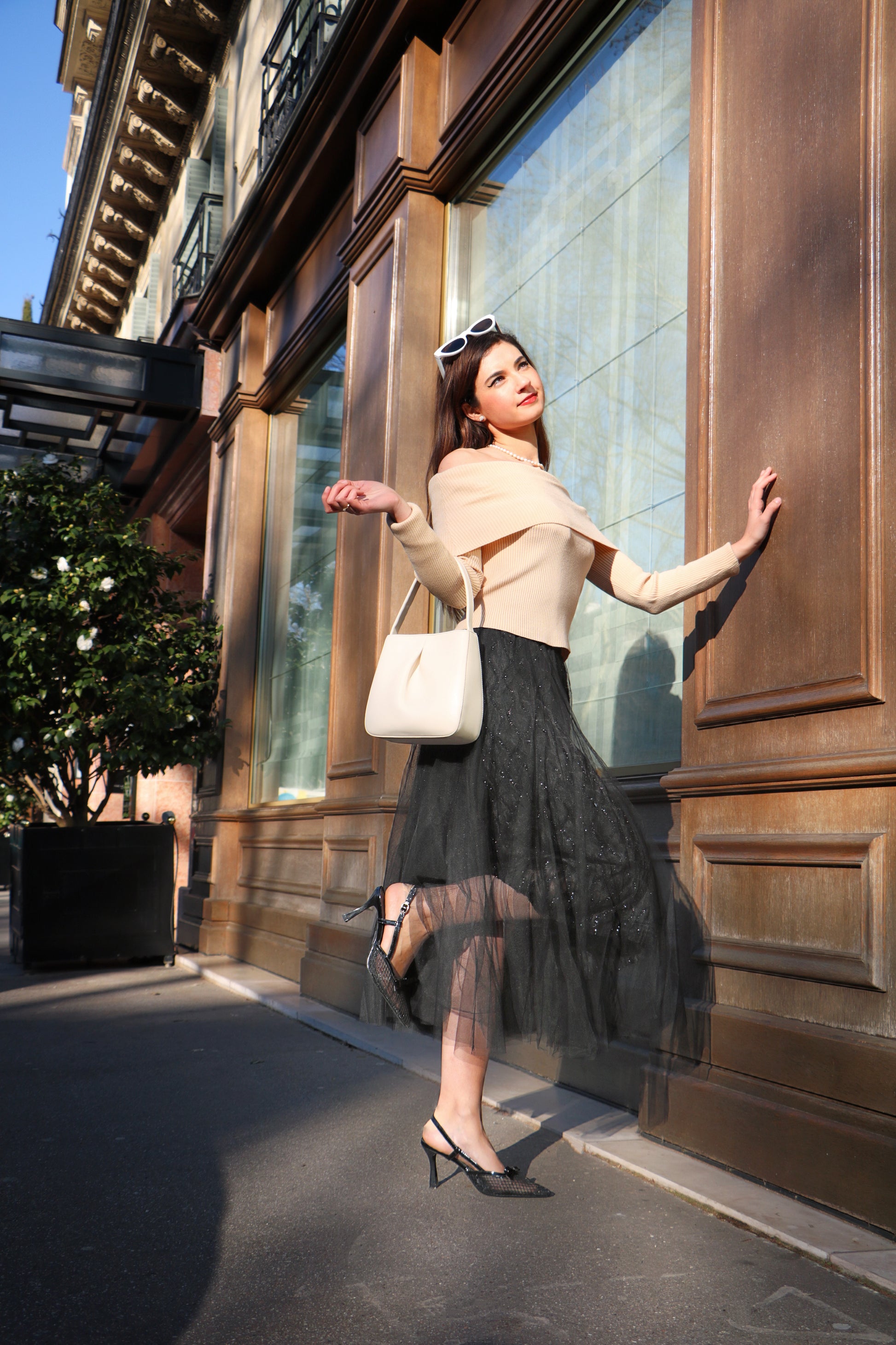 Haut Beige manche longue épaule dénudé et Jupe longue plissée